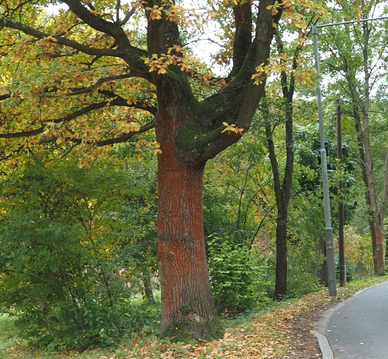 Kmen dubu porostlý červenou řasou a nahoře i mechem.