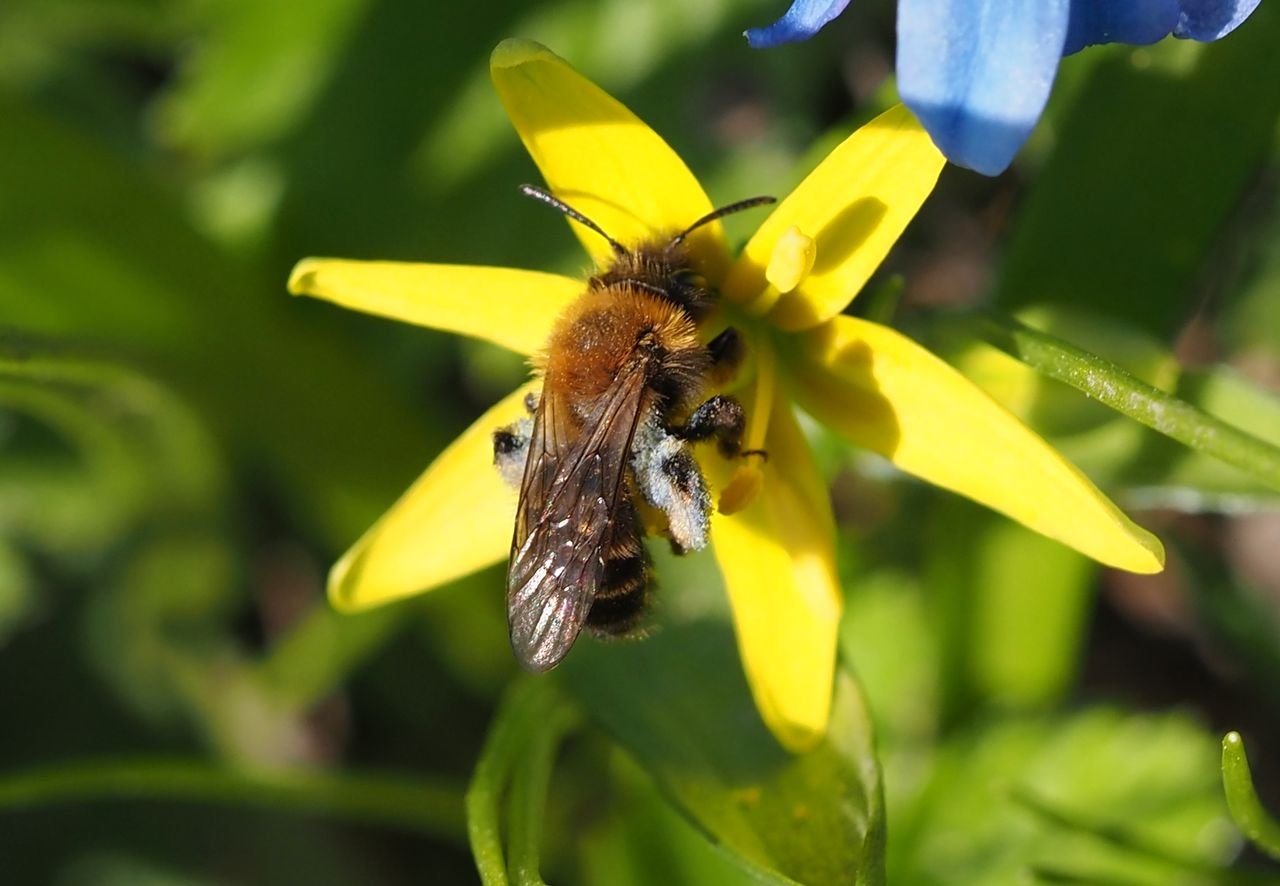 Osmia cornuta) při práci na květech. Včely zednice mají sběrací kartáč na sběr pylu na spodní straně zadečku.