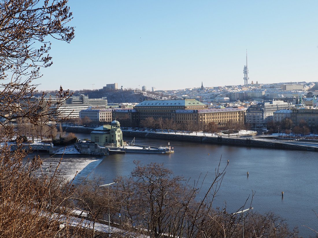 Nahoře na obzoru v levé polovině fotografie je Národní památník na Vítkově se slavnou sochou Jana Žižky na koni. V pravé polovině fotky je na obzoru nepřehlédnutelná Žižkovská televizní věž. Ve velké budově na břehu Vltavy sídlí ministerstva a další úřady.