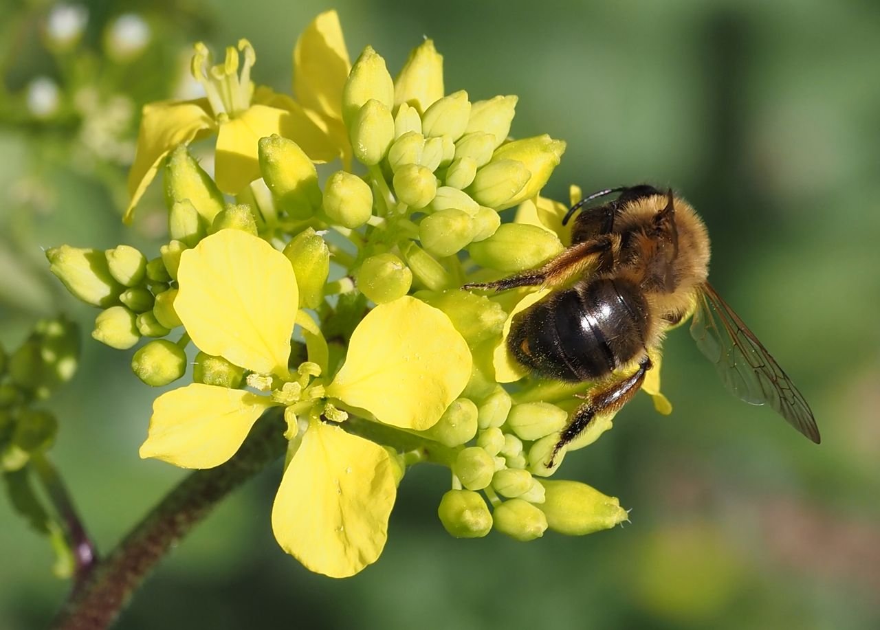 Hořčice má ve květech hodně pylu a nektaru, létaly na ní i další zdravé pískorypky. Ty se tu také živily nektarem, současně sbíraly pyl.
